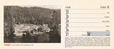 Stolní týdenní kalendář s reprodukcemi starých pohlednic měst, obcí, vesnic a osad Šumavy. Kalendář dále obsahuje i plánovací kalendář na aktuální rok, jmenný kalendář a stránku na poznámky.