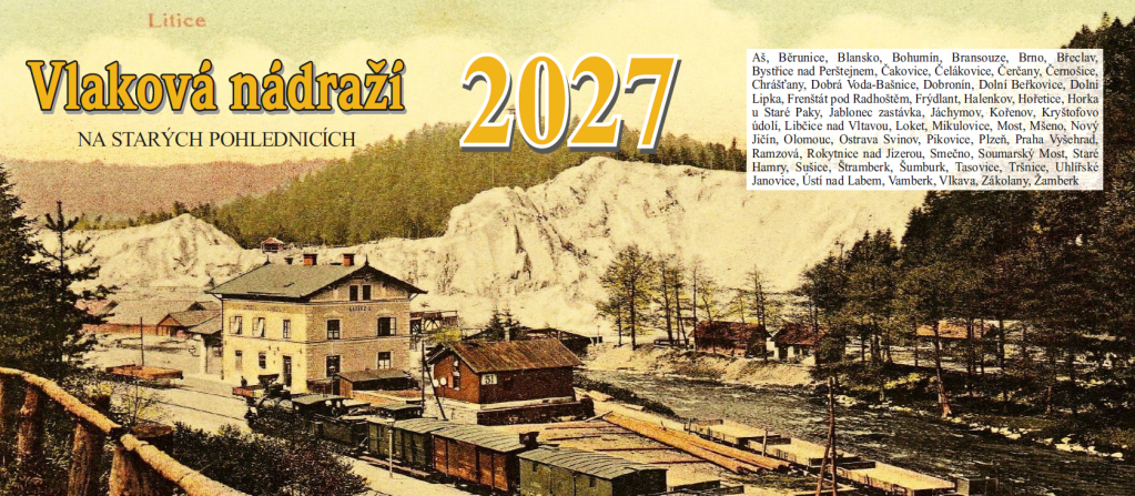 Týdenní stolní kalendář s vlakovými nádražími na starých pohlednicích.