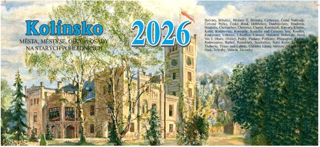 Stolní týdenní kalendář s reprodukcemi starých pohlednic měst, obcí, vesnic a osad Kolínska.